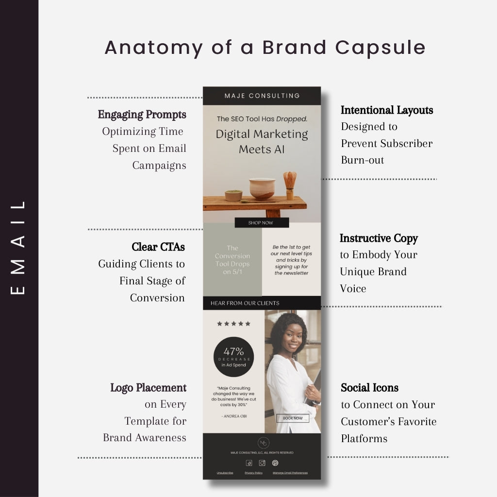 - Holistic Marketing Strategy: The strategic fusion of intentional copy and elevated aesthetics reduces time spent building marketing campaigns for email and social media.